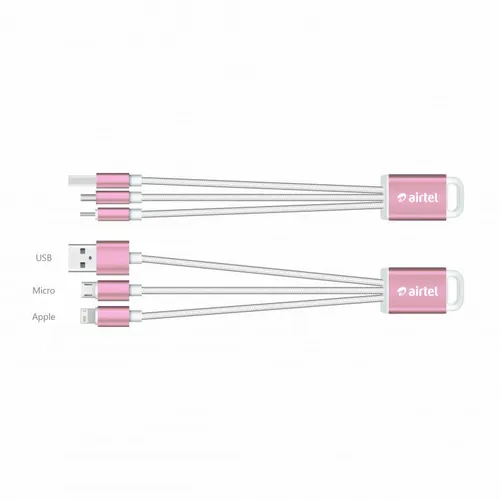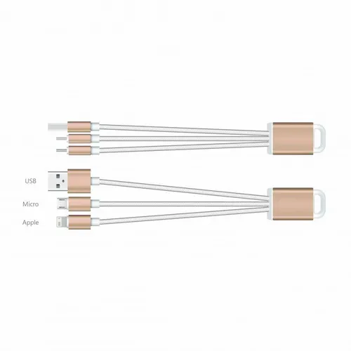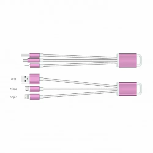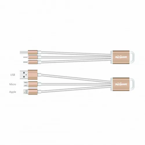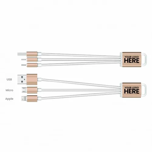 The perfect companion to the stylish tech enthusiast. With the elegant metallic design and durable braided cables this charging cable adds elegance to utility and can be engraved for a subtle refined style or imprinted with colour to give your client's logo pop! The cable includes USB, MicroUSB, and 8-pin style tip to cover most Android and other devices.