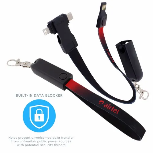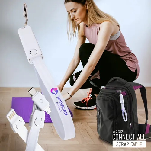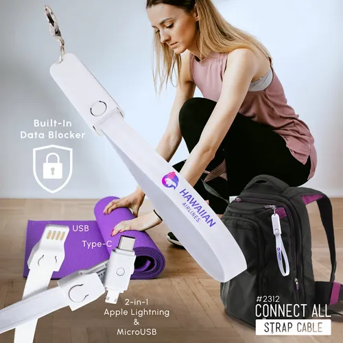 Connect All Strap Cable is compatible with Micro USB Android, Type C Android and iPhone. With built-in data block feature, you can charge safely and securely in public. Fashionable and Convenient with nice full colour branding area on the fabric strap. Optional decorating area on the cap. Attach it on your belt loop, backpack, tote, purse, etc. Great giveaway item that customers will carry it and use it everyday.