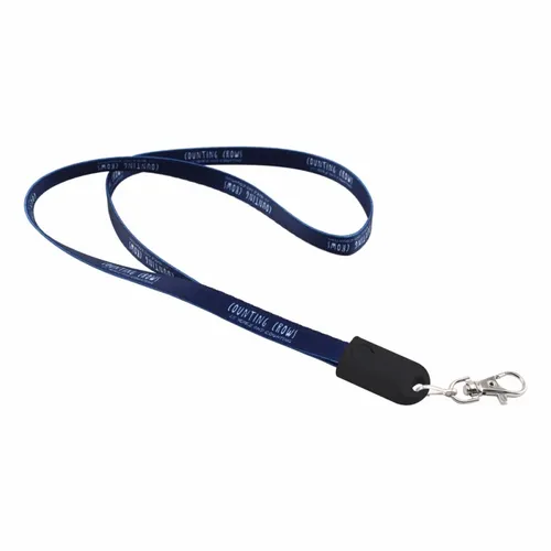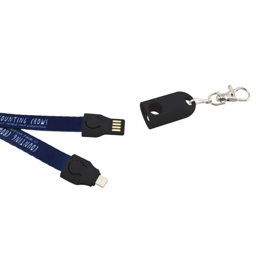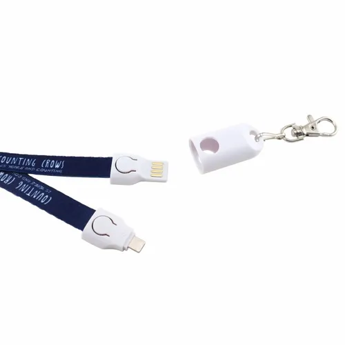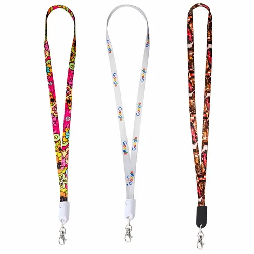 The perfect item for conventions, trade shows, and sporting events! The Fabric Lanyard Charging Cable provides a comfortable strap to keep your badge, keys, etc on your neck. Simply detach the keychain clip and the lanyard becomes 3' charging cable that is compatible with most Android and other devices. The 3' cable is full-colour print capable to clearly display your client's logo!