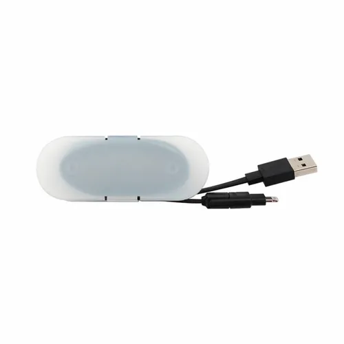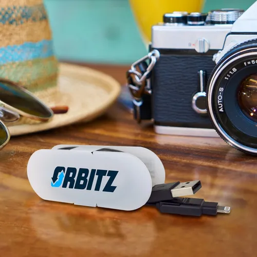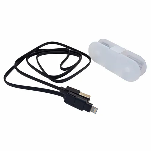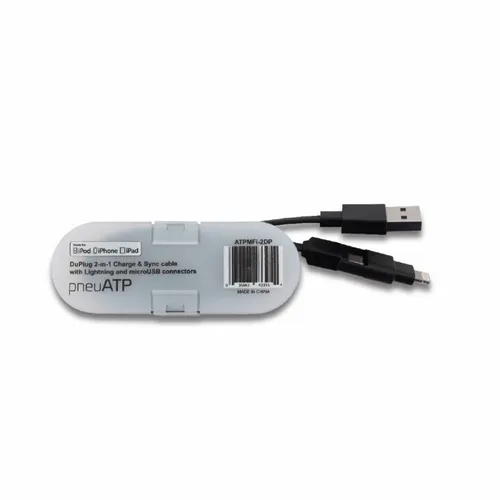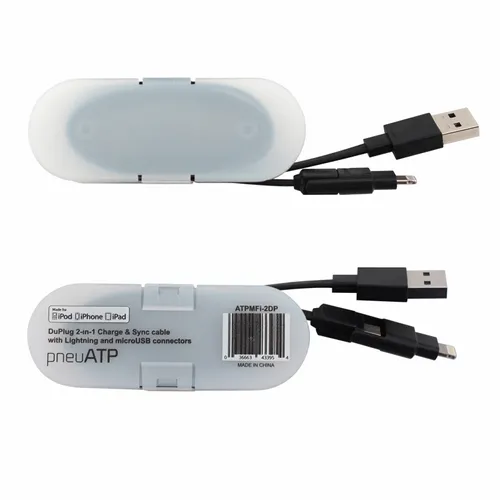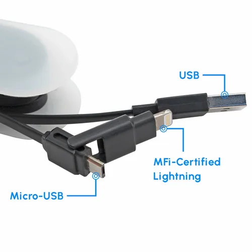 2-in-1 MFi Certified 8- pin Cable and Micro-USB with cord wrap container for easy portability.