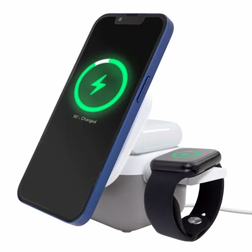 The Chi-Charge Modular 3-in-1 Wireless Charger will charge AirPods, Apple Watch, and a phone all at the same time. It's a cleverly designed compact device that makes it perfect for teams that travel, work in the office, or at home. The three sectional pieces can be assembled quickly and easily to start charging three compatible devices with fast charge technology.