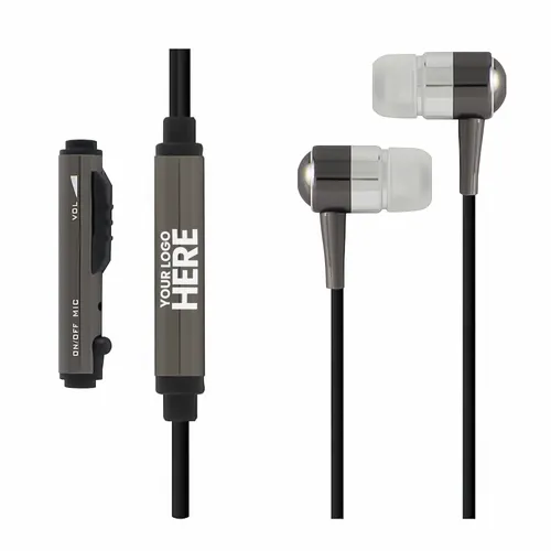 Metal hi-definition ear buds feature integrated volume control and microphone with premium sound quality and noise isolating design. Imprint your logo on the y-piece (centre tube). Use with computers, mp3 players, smart phones and more.