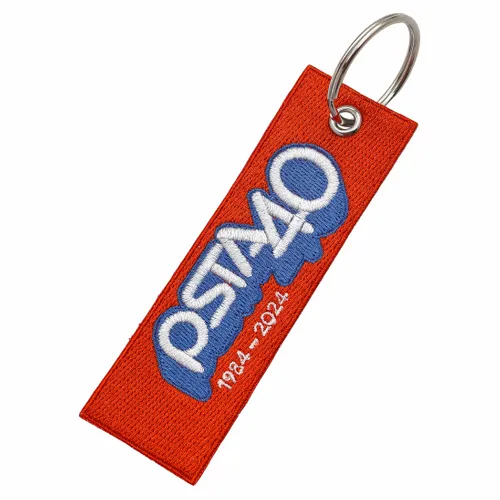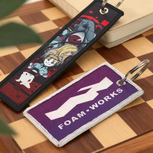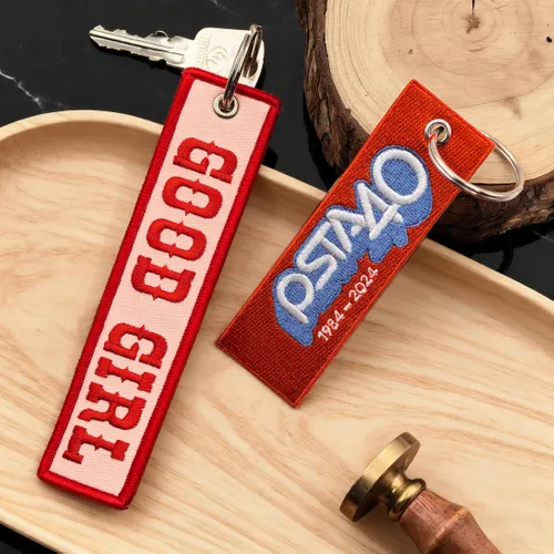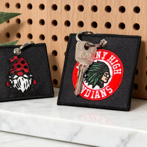 Here's the perfect keychain you are looking for. An Embroidered Patch on a keychain. The actual letters can be stitched in just about any colour desired, Pick the colours and text that you want. Finished with Metal ring with eyelet and merrowed border. A maximum of 12 colours and you can choose the shapes that fit on your artwork.