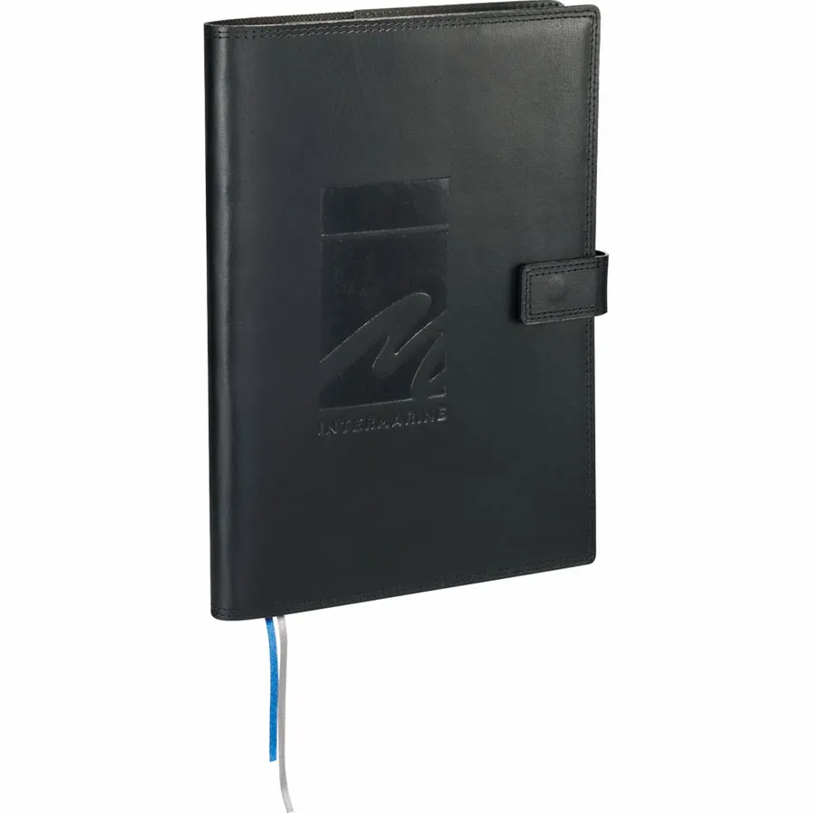 Record your notes in style with the 7 x 10 FSC Mix Uptown Refillable Leather Journal, which features a genuine premier leather hard cover with a double-stitched border. This sophisticated leather-cover journal contains a 128-page FSC Mix white lined paper refill and has blue and silver ribbon page markers to hold your place. It also includes a business card slot, an elastic pen loop, and a magnetic tab closure for added convenience.