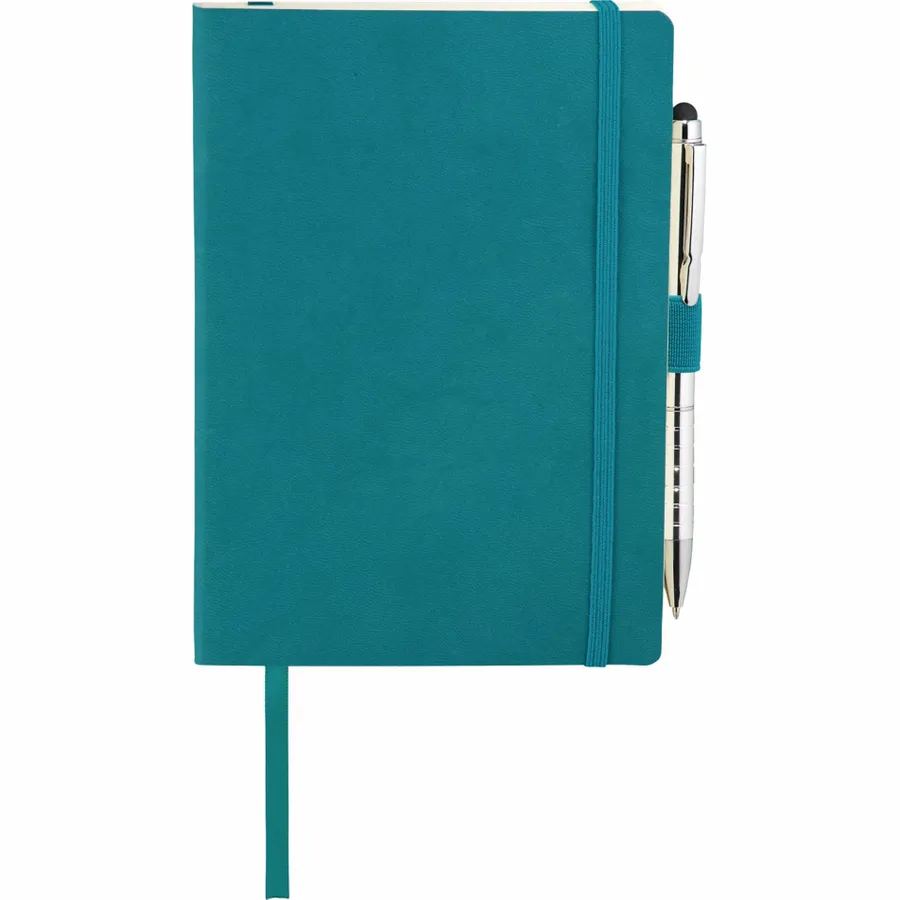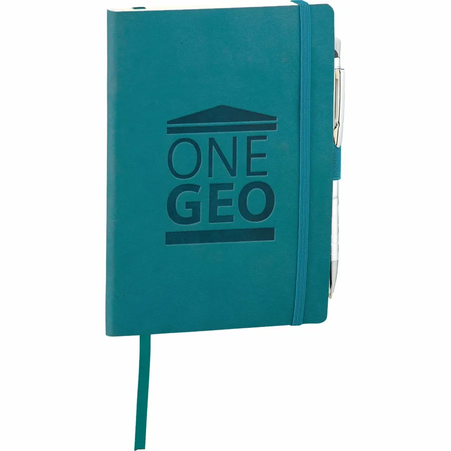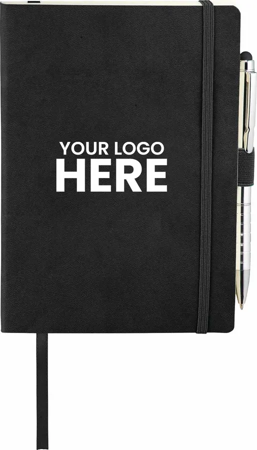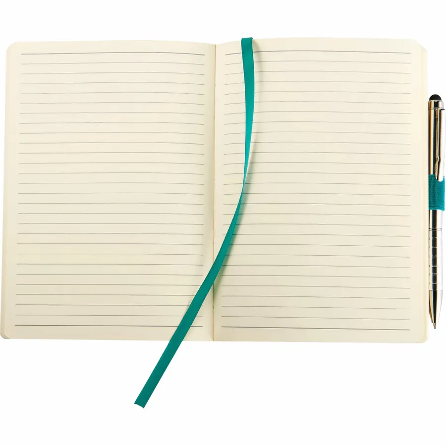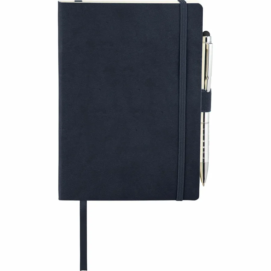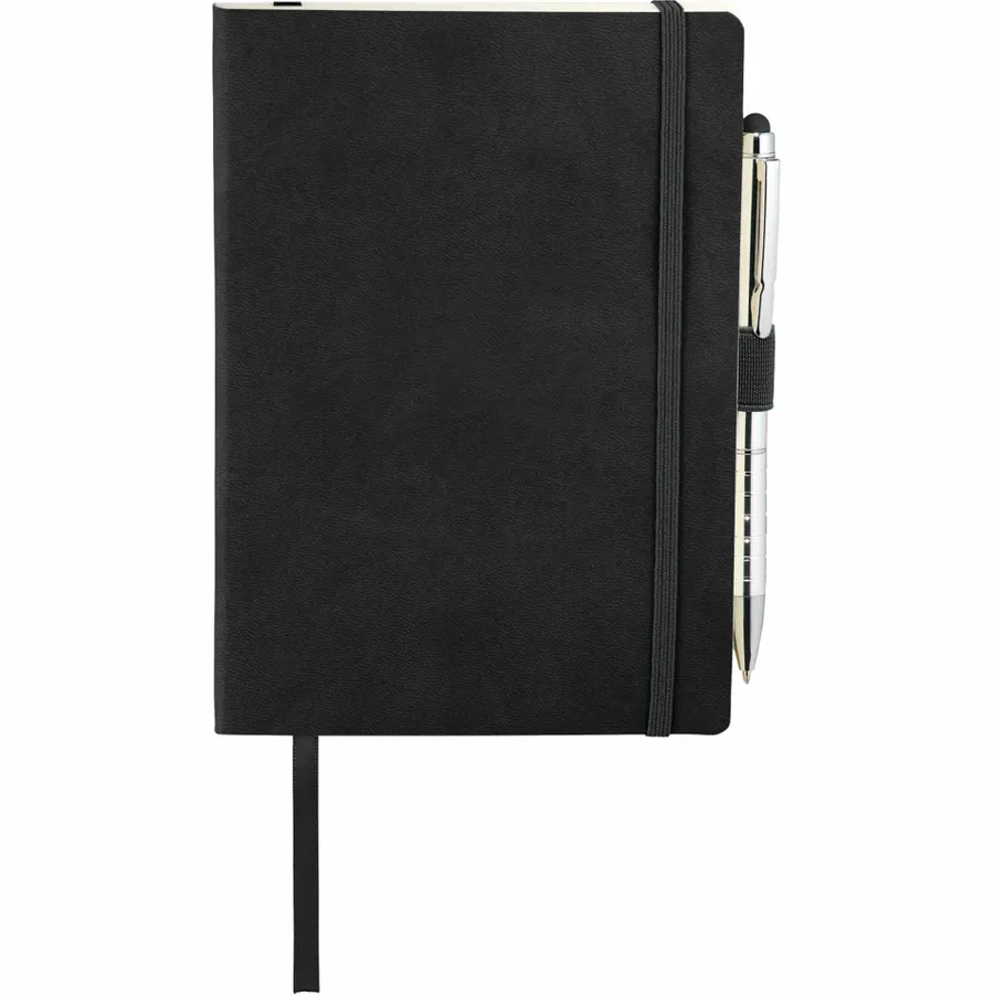 The 5 x 7 FSC Mix Revello Soft Bound Journal features a flexible, soft cover with built-in elastic closure. This custom notebook includes a ribbon page marker to save your place. The Revello Soft Bound Journal includes a pen loop (pen is not included), document pocket on interior back cover, and includes 80 sheets of cream lined FSC Mix paper.
