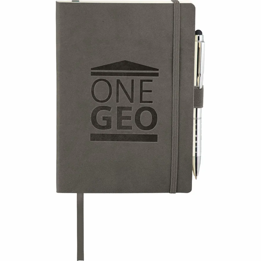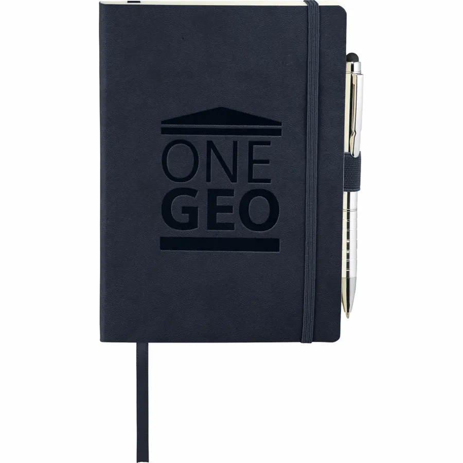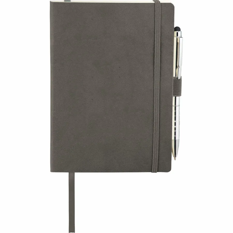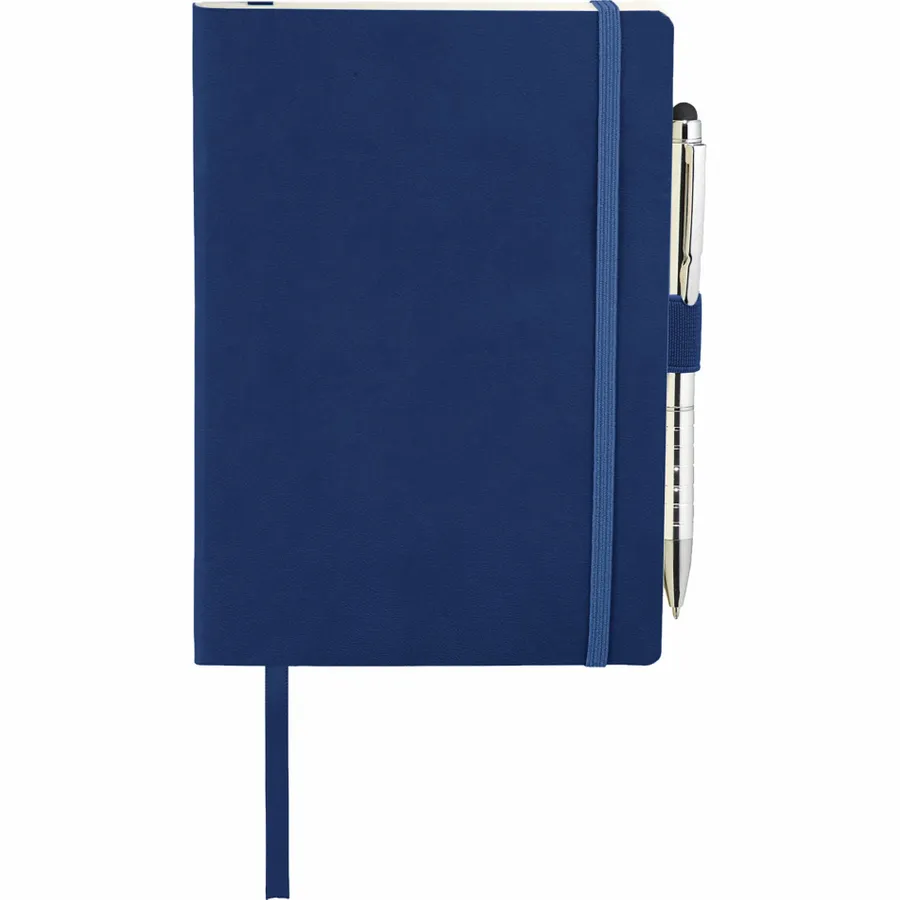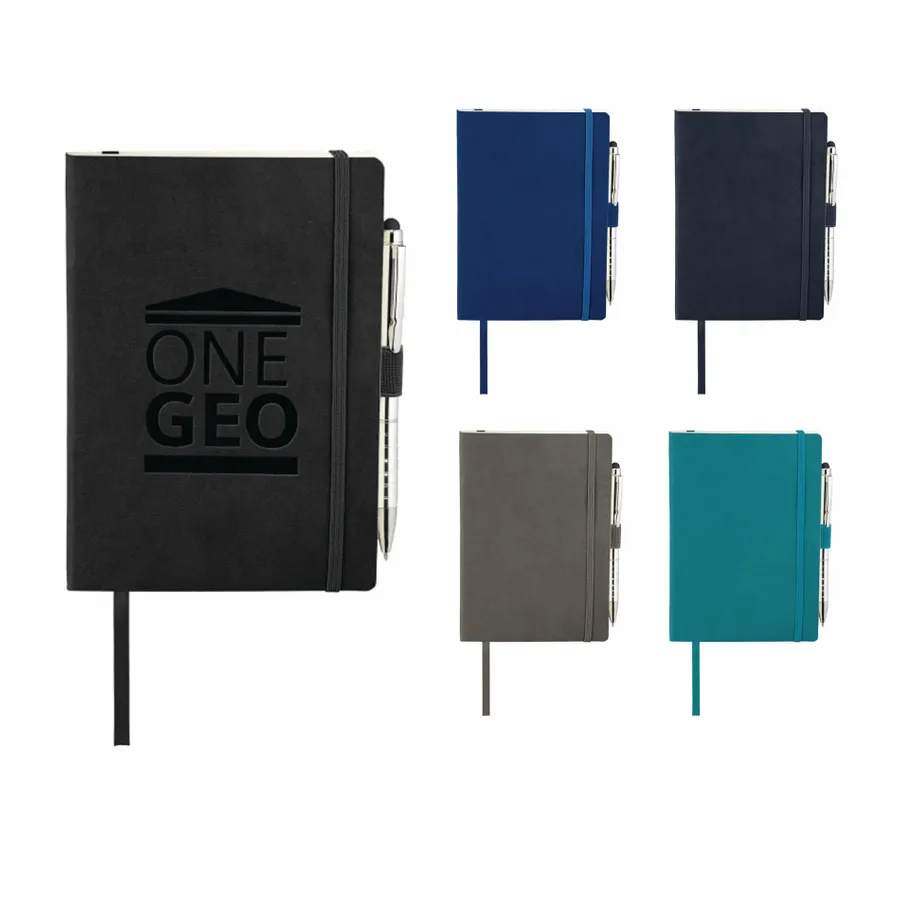The 5 x 7 FSC Mix Revello Soft Bound Journal features a flexible, soft cover with built-in elastic closure. This custom notebook includes a ribbon page marker to save your place. The Revello Soft Bound Journal includes a pen loop (pen is not included), document pocket on interior back cover, and includes 80 sheets of cream lined FSC Mix paper.