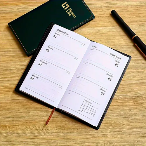 A compact and stylish planner with a durable PU leather cover, perfect for on-the-go organisation and note-taking.Size: 3.46 in x 6.7 inCover: PU leatherPages: 96 pages (80g writing paper)Colours: Black, Blue, Burgundy, GreenWeight: 170gCustomisation: UV printing, foil printing, debossedPrinting Area: 2 in x 4 inIdeal for professionals and students who need a portable, elegant planner for daily planning.
