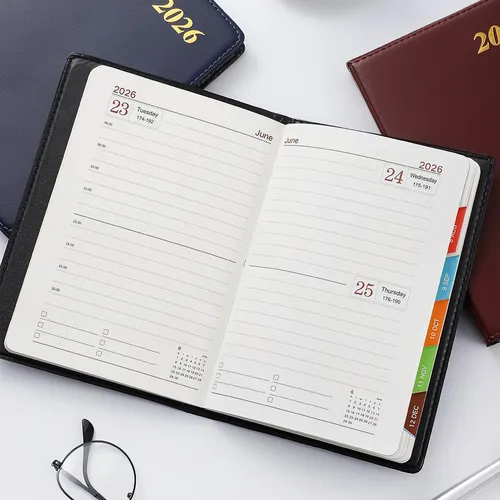 A sleek, soft-touch planner with a durable PU leather cover, designed for daily planning and professional use.Size: 5.5 in x 8 inCover: PU imitation leatherPages: 100 pages (70g writing paper)Layout: Includes daily planColours: Black, Burgundy, Dark BlueWeight: 0.29 kgCustomisation: Debossed, foil stamped, UV colour printingPrinting Area: 3 in x 6 inPerfect for professionals and students seeking a stylish, functional planner for daily organisation.