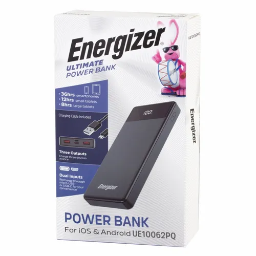 A great looking Energizer power bank with 10,000 mAh battery capacity. It's a great device for daily use for any busy professional. Specifications: Cell Type: Lithium Polymer/ Battery Capacity: 10000 mAh/37Wh(Max.)/ Rated Input: Micro USB 5V =-2A, 9V=2A/ Rated Input: USB-C PD 5V=3A, 9V=2A/ Rated Output 1: USB-C PD 5V=3A, 9V=2.2A, 12V=1.5A/ Rated Output 2: USB-A 5V=3A, 9V=2A, 10V=2.25A, 12V=1.5A/ Rated Output 3: USB-A 5V=3A, 9V=2A, 10V=2.25A, 12V=1.5A/