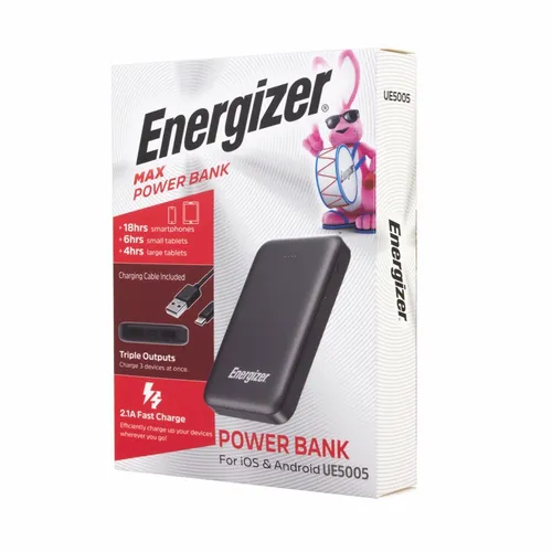 A great looking Energizer power bank with 5,000 mAh battery capacity. It's a great device for daily use for any busy professional. Specifications: Model 'Name: UE5005/ Cell Type: Lithium Polymer/ Battery-Capacity: 5OOO mAh/18.5Wh(Max.)/ Rated Input: USB-C 5V=2A/ Rated Output 1: USB-A 5V=2.1A/ Rated Output 2: USB-A 5V=2.1A/ Rated Output 3: USB-C 5V=2A/ Total Output: 10.5W(Max.)