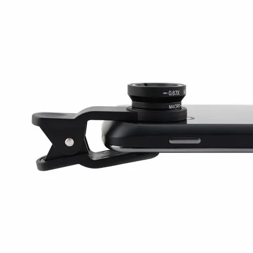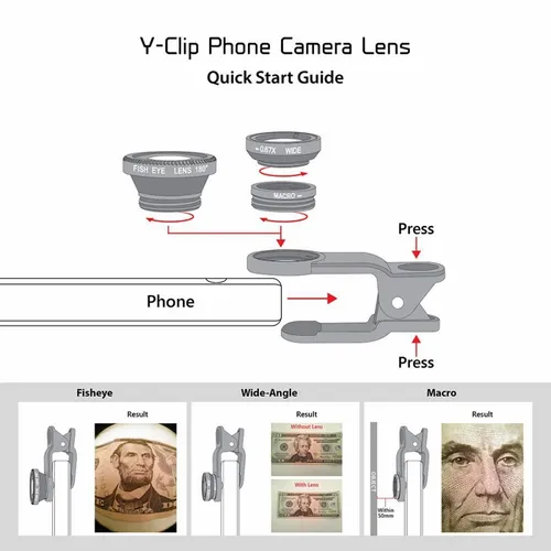 Simply clip onto your smartphone camera and have fun taking photos. This Y-Clip Phone Lens Pack includes: 1 x Macro Lens 1 x Wide Angle Lens 1 x Fish Eye Lens 1 x Zip Case