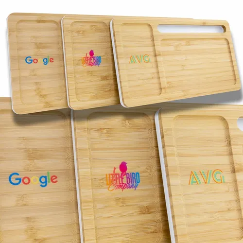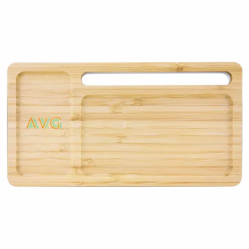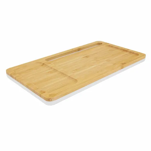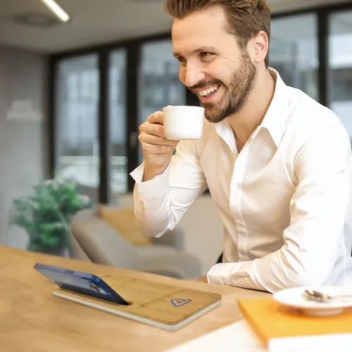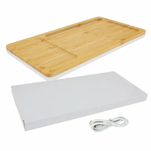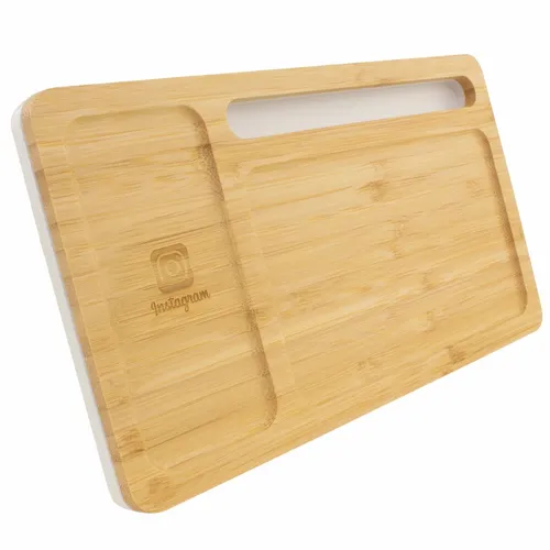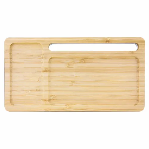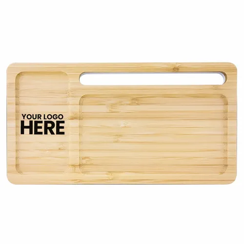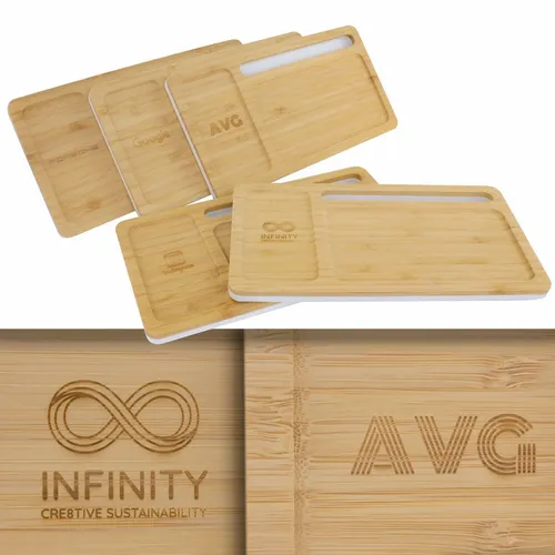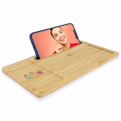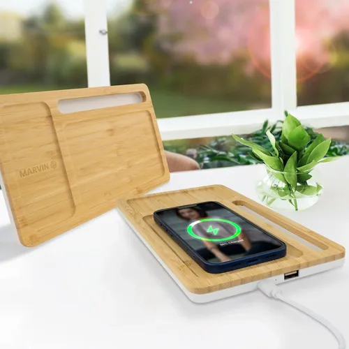 It's a bamboo-topped desktop charging phone tray. It will help maintain a tidy desktop, wirelessly charge a phone, and has an additional spot for business cards. The long and narrow groove is a convenient space to prop up a phone. It has a large visual space for branding and the natural colour and modern design will match well with an office environment that is bright with life.