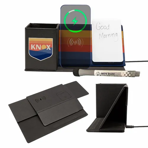 Coming end of April. The Chi-Charge Desktop Organizer offers ample branding space with full-color printing, making it perfect for showcasing your brand and communicating your message effectively. It features a fast 15W wireless charging spot for phones and a dedicated charging spot for AirPods. Plus, it’s designed for easy storage and shipping, as it can be shipped flat. It also has a Type-C input, pen holder, detachable dry-erase board, and marker.