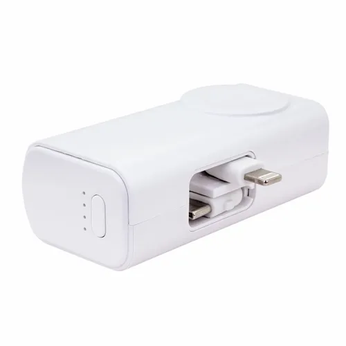 5,000 mAh battery capacity dual charging power bank with Lightning, Type-C plugs, and watch charger.