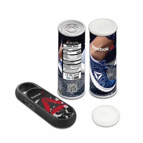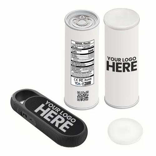 The Soul Speaker is a portable Bluetooth speaker with a lever clip to easily attach to a backpack, handbag, or carrying case while traveling. Plus, it comes packaged in a fun and unique custom-branded pull-tab pop-can. It's a memorable and playful way to give a gift that will bring the joy of music while on 'Soul'ful journeys. It is available for full-colour printing on the speaker grill and pop-can packaging.